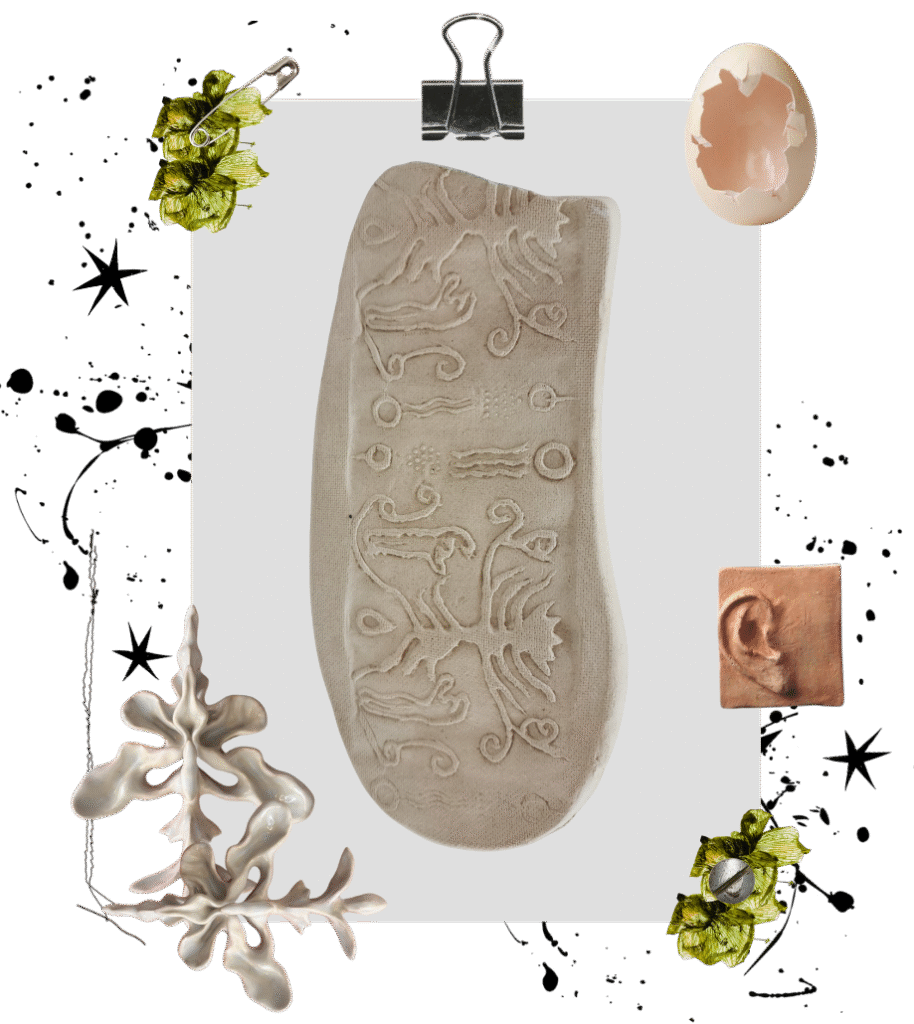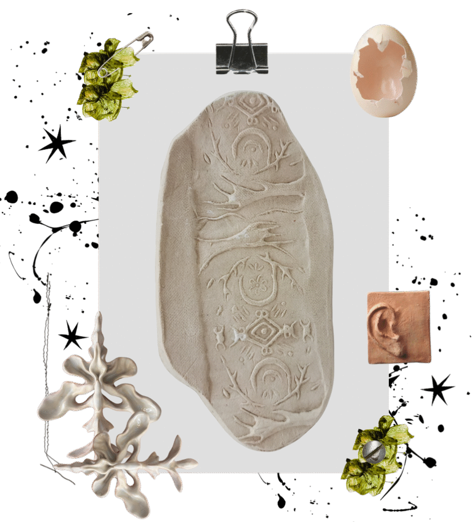 La pieza central, El Sabio del Bosque (Elnar) es una escultura antropomorfa que fusiona rasgos élficos con iconografía precolombina, representando un guardián de conocimiento ancestral. La serie incluye además placas cerámicas con grabados que funcionan como sellos, creando superficies texturadas que evocan petroglifos y sistemas de escritura visual indígena. Los motivos grabados abordan feminidad espiritual y lo sagrado desde perspectivas no occidentales.